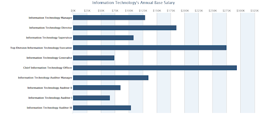 Job TitleSalaryHourly Rate Location Date UpdatedInformation Technology Manager$129,334 $62.18United States April 26, 2022Information Technology Director$185,221$89.05United StatesApril 26, 2022Information Technology Supervisor$108,705$52.26United StatesApril 26, 2022Top Division Information Technology Executive$275,172$132.29United StatesApril 26, 2022Information Technology Generalist$74,159$35.65United StatesApril 26, 2022Chief Information Technology Officer$293,562$141.14United StatesApril 26, 2022Information Technology Auditor Manager$135,399$65.10United StatesApril 26, 2022Information Technology Auditor II$85,249$40.99United StatesApril 26, 2022Information Technology Auditor I$66,085$31.77United StatesApril 26, 2022Information Technology Auditor III$103,906$49.95United StatesApril 26, 2022
